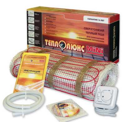 Нагревательный мат – это модификация кабельного электрического тёплого пола, кабель в котором более тонкий. В термоматах кабель, служащий для нагрева, крепят на сетку. Следует отметить, что стяжка и клей без проблем проникают сквозь сетку, гарантируя надёжную укладку. При установке данной системы уровень пола незначительно поднимается.