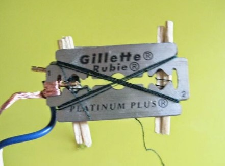 - Изначально нужно взять: Провод с вилкой, два лезвия, нитки, спички.